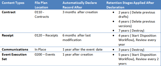 Below is a table that outlines the retention policies that will be assigned to our different types of content. It is important to note that in SharePoint 2010 we have a choice of where that retention is applied from – either on the Content Type or a Folder. In our example, any items declared In-Place as records will use the retention policies applied at the Content Type level. Any items that are routed to the Records Centre will inherit retention from the file plan that they reside in: