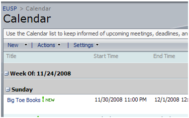 On a busy SharePoint site, a master calendar can easily become a problem. If you have more than 10 events per day, viewing these in a Calendar or list view is not very practical. A better approach in some cases might be a special list view which groups items similar to Microsoft Office Outlook.
